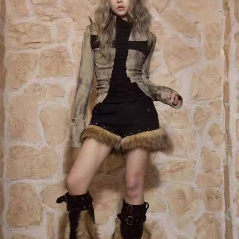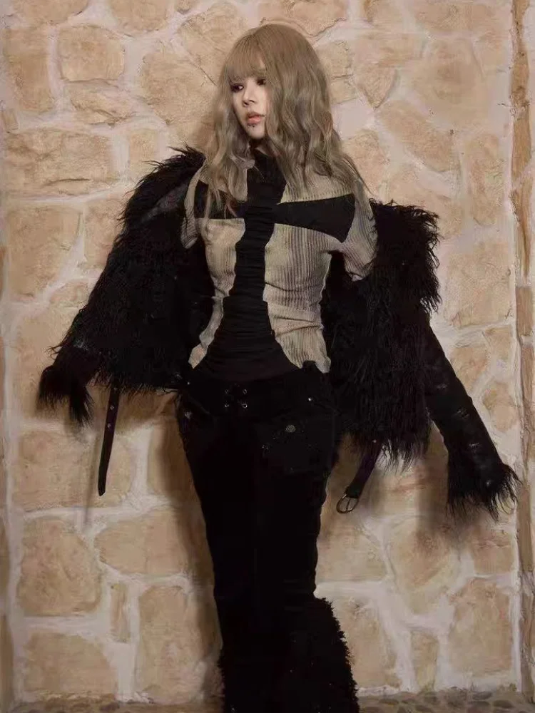 Women Y2K Clothing Ribbed Tops Vintage Harajuku Cross Print T-Shirt Grunge Aesthetic Long Sleeve Patchwork Tops Trend 2000S